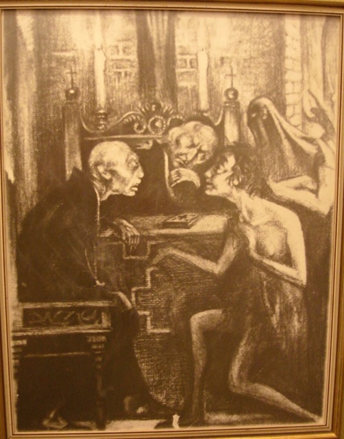 1923. Photograph of a print entitled "Badanie czarownicy" [Examination of the witch] or "The Spanish Inquisition". Possibly an illustration for a book. Courtesy Ruth Lewis, formerly Ruth Leiserowitz, Bethesda, Maryland, USA. A photograph is in the Biedermann Album in the State Archives in Łódź.